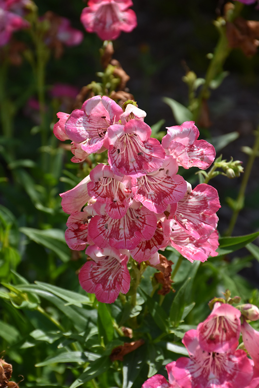 A stunning penstemon producing a profusion of large rose trumpet flowers with darker red and white stripes, rising above the foliage; long blooming, vigorous, and easy to grow; a grand visual impact when massed in the garden, along walkways, or in borders