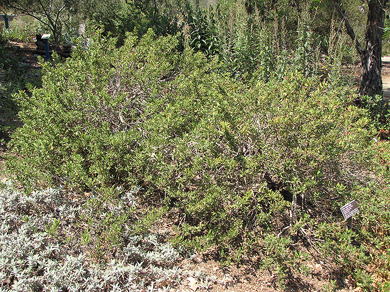 Pretty white flowers appear from late winter into spring on this highly aromatic native shrub common to coastal California; a low spreading, highly drought tolerant variety, great for groundcover or cascading over walls; attracts pollinators