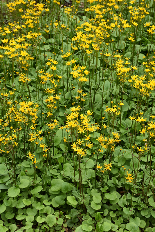A beautiful mounding perennial, producing heart shaped, dark green basal leaves with purple undersides; showy, golden-yellow daisy-like flowers rise on sturdy stems in spring through summer; roots will colonize, achieving a groundcover effect over time