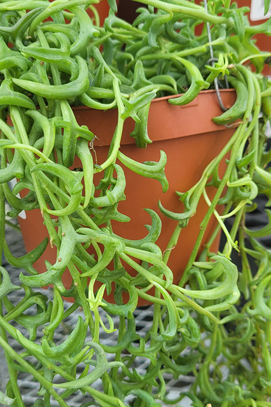 A spectacular and highly unusual trailing succulent with shiny green foliage that is shaped like tiny dolphins, strung along the cascading branches; a dramatic accent when spilling over the edges of containers and hanging baskets