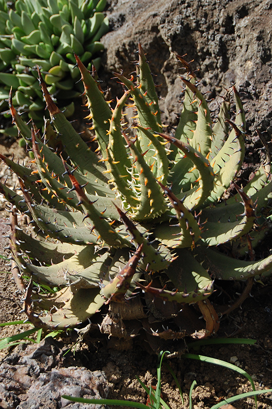 Black-spined Aloe features showy spikes of red flowers with orange overtones rising above the foliage in mid winter. It has attractive grayish green foliage with pointy black spines and tinges of red. The succulent narrow leaves are highly ornamental and remain grayish green throughout the winter.