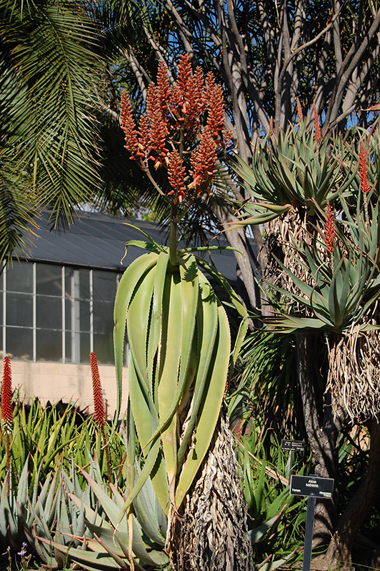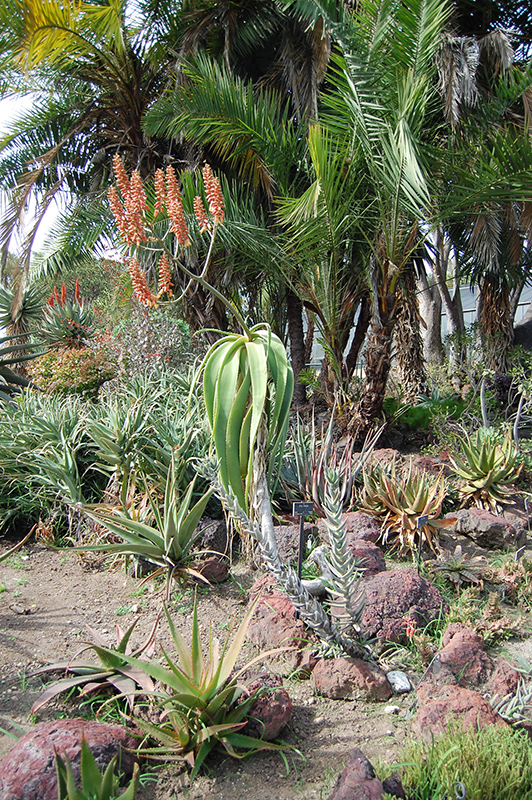 Yemen Tree Aloe features showy racemes of orange tubular flowers rising above the foliage from mid to late winter. It has attractive grayish green foliage with hints of chartreuse. The large succulent sword-like leaves are highly ornamental and remain grayish green throughout the winter. The mottled gray bark adds an interesting dimension to the landscape.