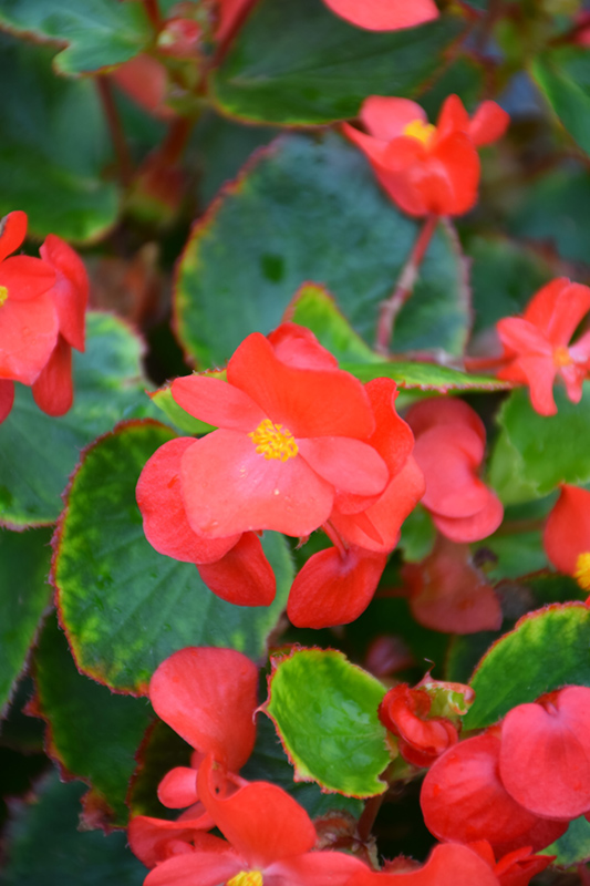 Eureka™ Green Leaf Scarlet Begonia features dainty clusters of scarlet orchid-like flowers with yellow throats at the ends of the stems from mid spring to mid fall. Its attractive glossy heart-shaped leaves remain green in colour throughout the season.