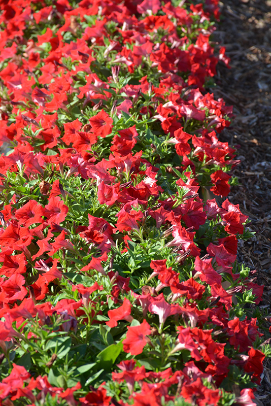 Whispers™ Red Petunia will grow to be about 12 inches tall at maturity, with a spread of 24 inches. When grown in masses or used as a bedding plant, individual plants should be spaced approximately 20 inches apart. Its foliage tends to remain dense right to the ground, not requiring facer plants in front. This fast-growing annual will normally live for one full growing season, needing replacement the following year.