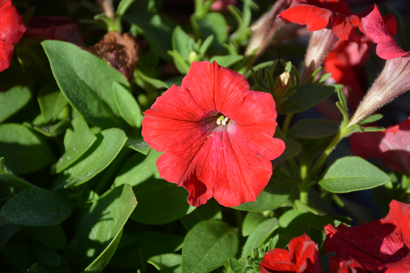 Whispers™ Red Petunia is a dense herbaceous annual with a trailing habit of growth, eventually spilling over the edges of hanging baskets and containers. Its medium texture blends into the garden, but can always be balanced by a couple of finer or coarser plants for an effective composition.