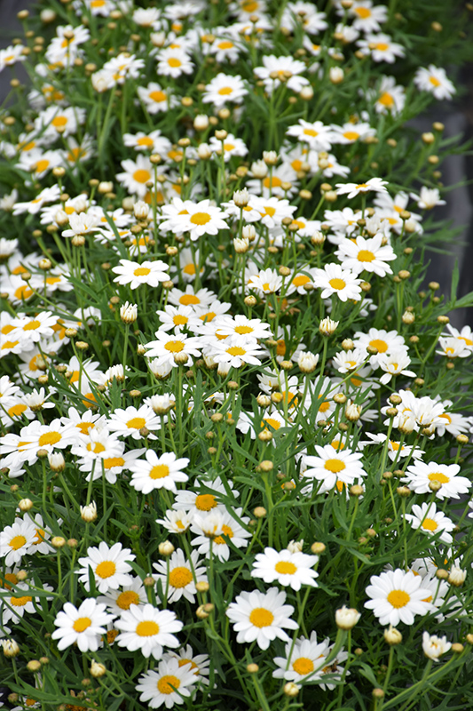 Percussion Perfect White Marguerite Daisy has masses of beautiful semi-double white daisy flowers with yellow eyes at the ends of the stems from late spring to early fall, which are most effective when planted in groupings. The flowers are excellent for cutting. Its tiny deeply cut ferny leaves remain dark green in colour throughout the season.