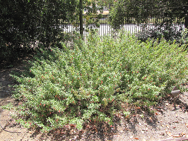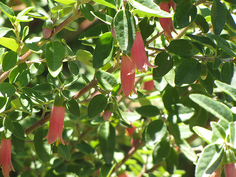 Dense, velvety gray-green leaves cover this low evergreen shrub; when massed it is a good groundcover; carmine red bell shaped flowers emerge in late winter and dangle at the end of the branches; drought tolerant once established