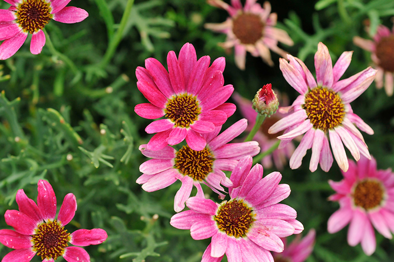 Grandaisy® Dark Pink Daisy has masses of beautiful hot pink daisy flowers with harvest gold eyes at the ends of the stems from mid spring to mid fall, which are most effective when planted in groupings. The flowers are excellent for cutting. Its tiny deeply cut ferny leaves remain green in colour throughout the season.