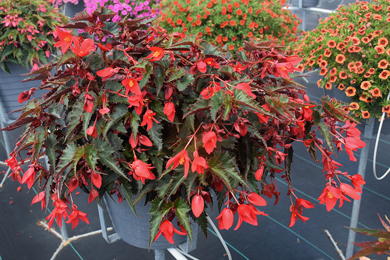 Mistral® Dark Red Begonia features showy nodding dark red bell-shaped flowers at the ends of the stems from mid spring to mid fall. Its attractive serrated narrow leaves remain green in colour throughout the season. The dark red stems are very colorful and add to the overall interest of the plant.