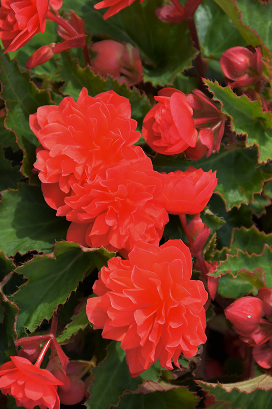RiseUp™ Tangerine Extreme Begonia features showy double orange orchid-like flowers with yellow throats at the ends of the stems from mid spring to mid fall. Its attractive small glossy pointy leaves remain dark green in colour with distinctive light green veins and tinges of burgundy throughout the year. The dark red stems can be quite attractive.