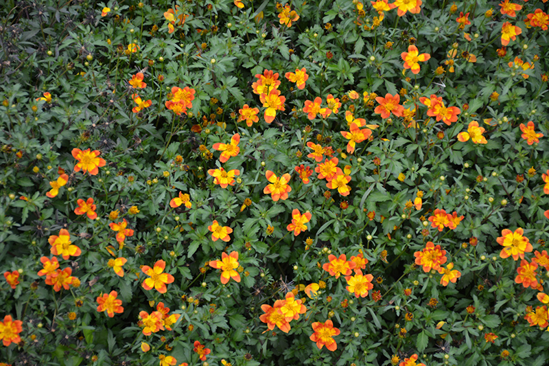 Bidy Boom Wildfire Bidens will grow to be about 18 inches tall at maturity, with a spread of 18 inches. When grown in masses or used as a bedding plant, individual plants should be spaced approximately 12 inches apart. Its foliage tends to remain dense right to the ground, not requiring facer plants in front. Although it's not a true annual, this fast-growing plant can be expected to behave as an annual in our climate if left outdoors over the winter, usually needing replacement the following year. As such, gardeners should take into consideration that it will perform differently than it would in its native habitat.