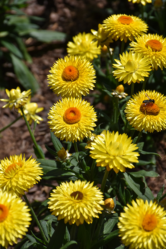Granvia Gold Strawflower features bold fully double yellow daisy flowers with gold eyes at the ends of the stems from mid spring to late fall. The flowers are excellent for cutting. Its narrow leaves remain dark green in colour throughout the season.