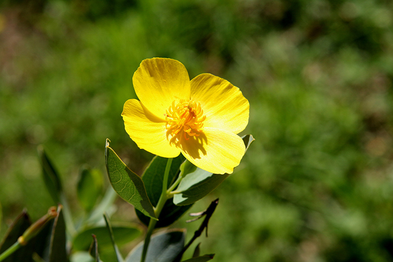 A wonderful evergreen shrub clothed with blue-green foliage, and is covered by large, brilliant yellow, cup shaped flowers from spring through summer; drought tolerant once established; a perfect accent shrub, or massed along borders