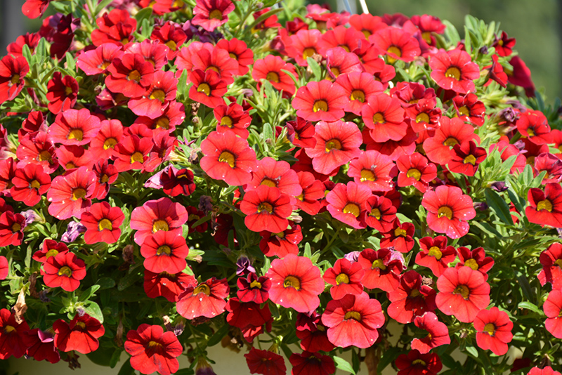Unique Dark Red Calibrachoa is draped in stunning red trumpet-shaped flowers with yellow throats at the ends of the stems from late spring to early fall. Its small pointy leaves remain green in colour throughout the season.