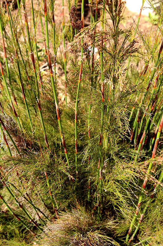 This is a prehistoric remnant, and is the tallest of living horsetails; clumps of towering spikes with narrow branchlets at the nodes creates a bold vertical effect that makes an excellent backdrop in a high groundwater area; very low maintenance