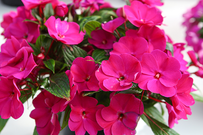 Painted Select Violet New Guinea Impatiens will grow to be about 19 inches tall at maturity, with a spread of 15 inches. When grown in masses or used as a bedding plant, individual plants should be spaced approximately 12 inches apart. Its foliage tends to remain dense right to the ground, not requiring facer plants in front. This fast-growing annual will normally live for one full growing season, needing replacement the following year.