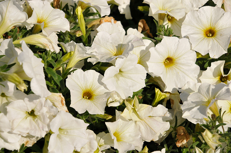 SuperCal® Pearl White Petchoa is blanketed in stunning white trumpet-shaped flowers with yellow centers at the ends of the stems from mid spring to late summer. Its pointy leaves remain green in colour throughout the season.