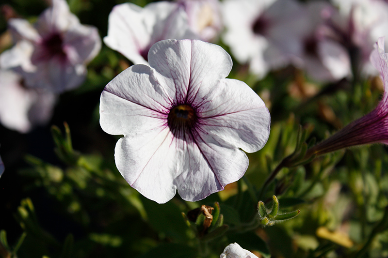 Durabloom® Silver Petunia is draped in stunning white trumpet-shaped flowers with plum purple centers at the ends of the stems from mid spring to mid fall. Its pointy leaves remain green in colour throughout the season.