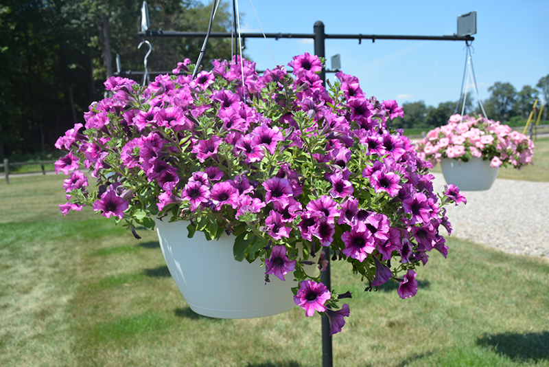 Main Stage™ Blueberry Petunia is a fine choice for the garden, but it is also a good selection for planting in outdoor containers and hanging baskets. Because of its trailing habit of growth, it is ideally suited for use as a 'spiller' in the 'spiller-thriller-filler' container combination; plant it near the edges where it can spill gracefully over the pot. Note that when growing plants in outdoor containers and baskets, they may require more frequent waterings than they would in the yard or garden.