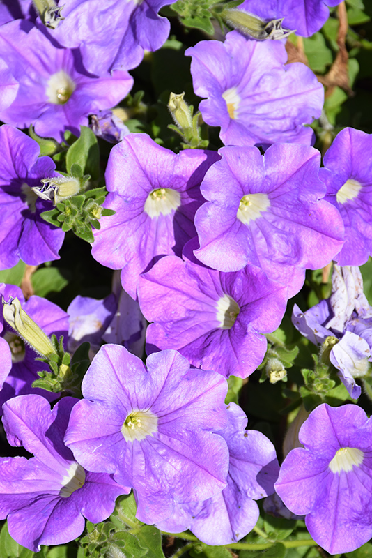 Surfinia® Blue Petunia is smothered in stunning blue trumpet-shaped flowers with lavender overtones at the ends of the stems from mid spring to mid fall. Its pointy leaves remain green in colour throughout the season.