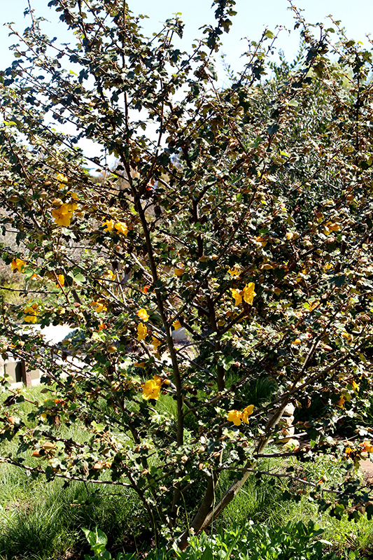 A more compact, low mounding selection producing large golden-yellow flowers in spring and summer; the fuzz (stellate hairs) on the leaves can be irritating to the skin, so use protective gloves and eyewear when handling; prefers dry to normal conditions