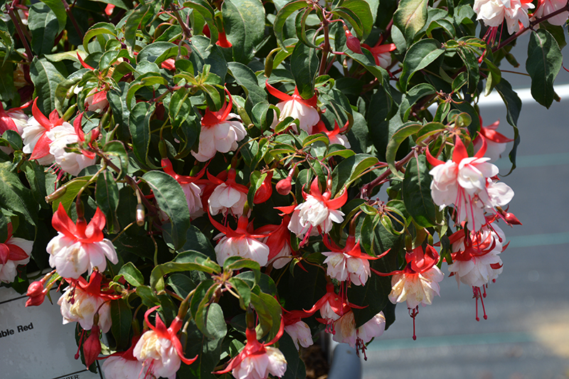 An outstanding fuchsia series that is very heat tolerant with great garden performance; this selection features double white corollas, with scarlet sepals; very attractive to hummingbirds; perfect for patio pots in sun or shade