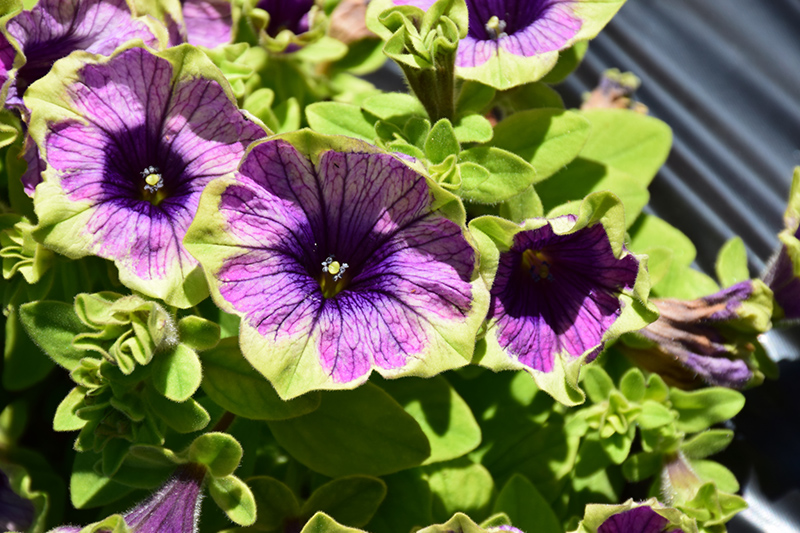 Surprise® Green Tambourine Petunia is blanketed in stunning purple trumpet-shaped flowers with lime green edges at the ends of the stems from mid spring to late summer. Its pointy leaves remain green in colour throughout the season.