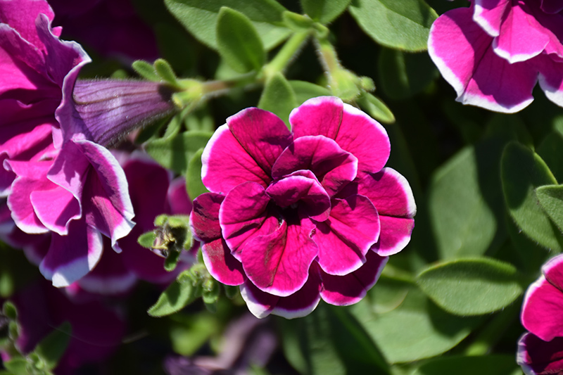SweetSunshine™ Purple Picotee Petunia is clothed in stunning double fuchsia trumpet-shaped flowers with white edges at the ends of the stems from mid spring to mid fall. Its pointy leaves remain green in colour throughout the season.