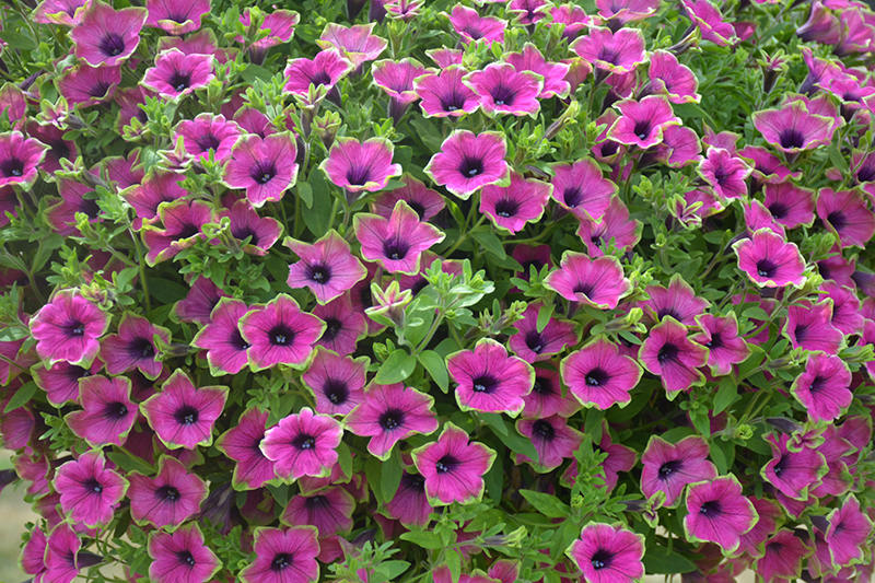 Tea Purple Green Edge Petunia is blanketed in stunning violet trumpet-shaped flowers with deep purple throats and lime green edges at the ends of the stems from mid spring to late summer. Its pointy leaves remain green in colour throughout the season.
