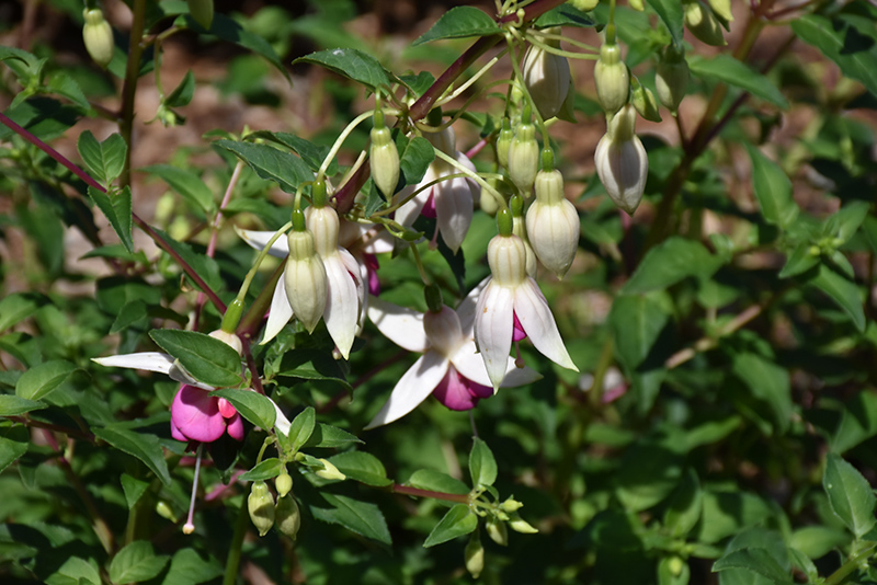 China Rose Fuchsia features dainty nodding rose bell-shaped flowers with white overtones and creamy white calyces at the ends of the branches from mid spring to mid fall. Its pointy leaves remain green in colour throughout the season.