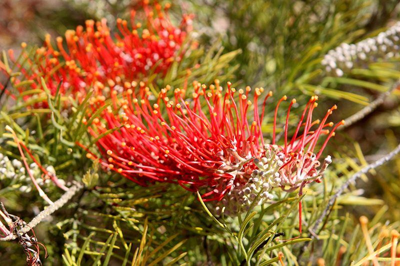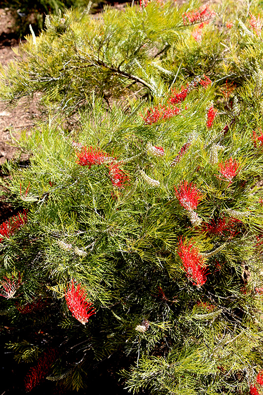 Kings Fire Grevillea features showy clusters of red spider-like flowers with orange overtones and gold tips at the ends of the branches from mid winter to late fall, which emerge from distinctive white flower buds. The flowers are excellent for cutting. It has attractive grayish green evergreen foliage which emerges chartreuse in spring. The deeply cut ferny leaves are highly ornamental and remain grayish green throughout the winter.
