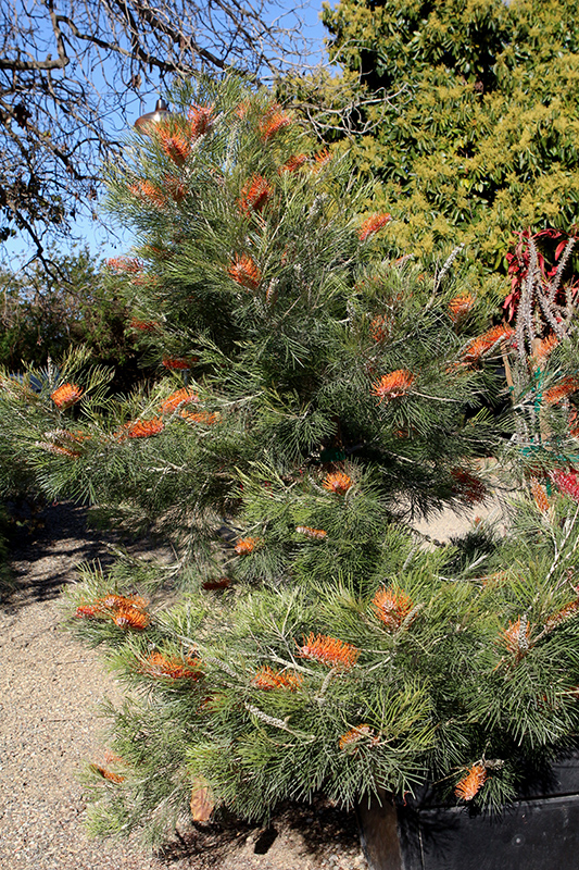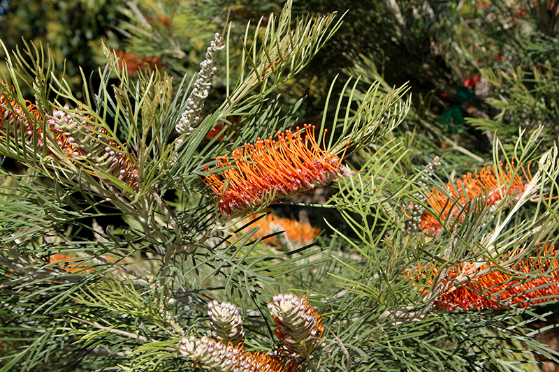 Little Honey Grevillea features showy clusters of gold spider-like flowers with orange overtones and yellow tips at the ends of the branches from mid winter to late spring, which emerge from distinctive white flower buds. The flowers are excellent for cutting. It has attractive green evergreen foliage which emerges chartreuse in spring. The deeply cut ferny leaves are highly ornamental and remain green throughout the winter. The smooth gray bark and tan branches add an interesting dimension to the landscape.