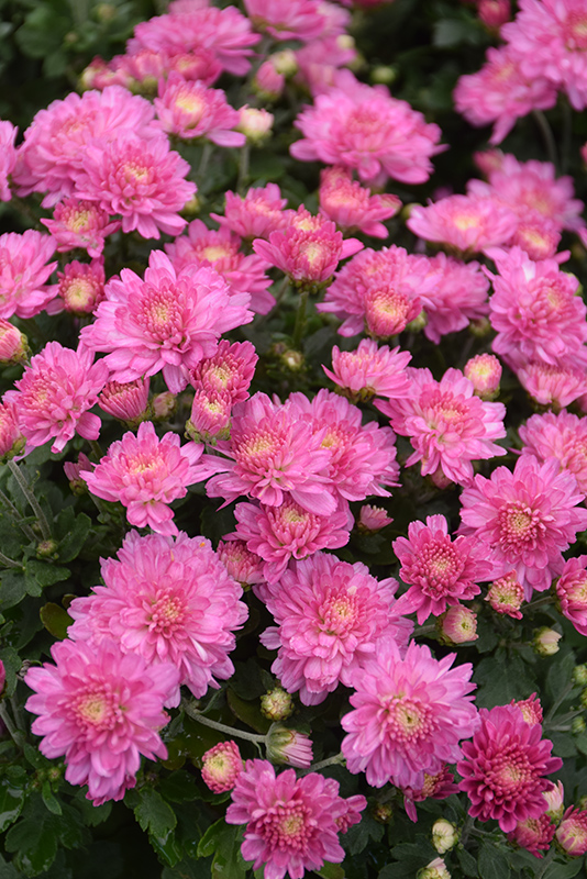 Chelsey™ Pink Chrysanthemum is smothered in stunning semi-double pink daisy flowers with yellow eyes at the ends of the stems from early to late fall. The flowers are excellent for cutting. Its fragrant ferny leaves remain green in colour throughout the season.