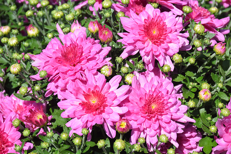 Fonti Dark Pink Chrysanthemum is smothered in stunning double pink daisy flowers with yellow eyes at the ends of the stems from early to late fall. The flowers are excellent for cutting. Its fragrant ferny leaves remain green in colour throughout the season.