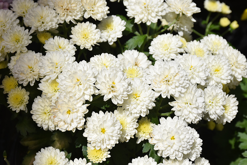 Jasoda White Chrysanthemum is covered in stunning double white daisy flowers with buttery yellow overtones at the ends of the stems from early to late fall. The flowers are excellent for cutting. Its fragrant lobed leaves remain dark green in colour throughout the season.