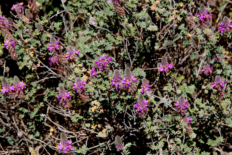 Sonoran False Prairie-clover features dainty clusters of violet pea-like flowers with purple overtones and gold anthers at the ends of the stems from mid spring to mid fall. Its attractive tiny tomentose oval compound leaves emerge pink in spring, turning bluish-green in colour with distinctive gray edges and tinges of silver the rest of the year. The brick red stems can be quite attractive.