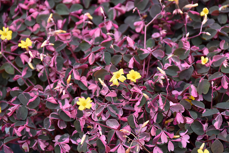 A tender perennial that creates a low, mounding mat of rusty red to plum purple shamrock-like foliage, variegated with bright pink; bright yellow flowers in spring and early summer, or year-round in mild climates; outstanding in the garden or containers