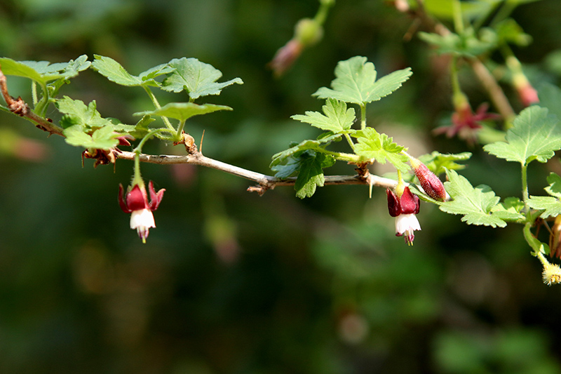 Bitter Gooseberry features dainty nodding burgundy bell-shaped flowers with white overtones along the branches from late winter to late spring. It features an abundance of magnificent red berries from early to late summer, which fade to deep purple over time. It has forest green deciduous foliage. The serrated lobed leaves turn outstanding shades of yellow, orange and scarlet in the fall. The spiny gray bark adds an interesting dimension to the landscape.