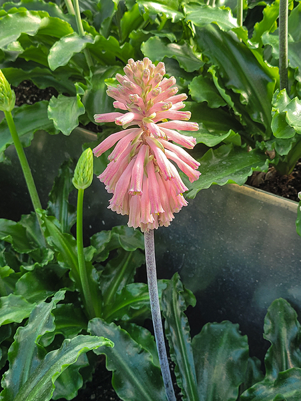 Dramatic rose-pink bottlebrush type flowers rise in winter from a rosette of broad, strap-like glossy foliage that dies back in summer; a brilliant border or container plant for winter color; reduce moisture after blooming; divide when dormant
