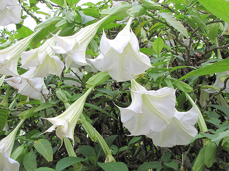 White Angel's Trumpet will grow to be about 8 feet tall at maturity, with a spread of 8 feet. It has a low canopy with a typical clearance of 2 feet from the ground. Although it's not a true annual, this fast-growing plant can be expected to behave as an annual in our climate if left outdoors over the winter, usually needing replacement the following year. As such, gardeners should take into consideration that it will perform differently than it would in its native habitat.