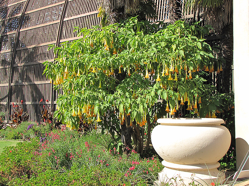 Autumn Treasure Angel's Trumpet is a fine choice for the garden, but it is also a good selection for planting in outdoor pots and containers. With its upright habit of growth, it is best suited for use as a 'thriller' in the 'spiller-thriller-filler' container combination; plant it near the center of the pot, surrounded by smaller plants and those that spill over the edges. It is even sizeable enough that it can be grown alone in a suitable container. Note that when growing plants in outdoor containers and baskets, they may require more frequent waterings than they would in the yard or garden.