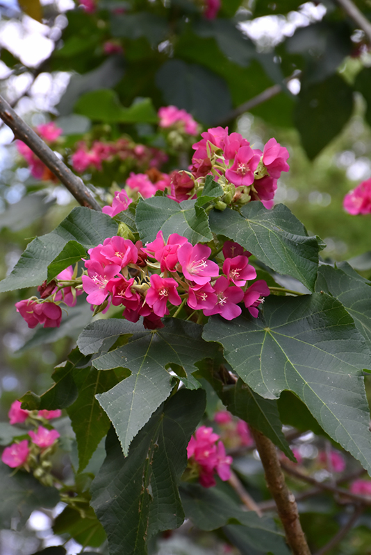 Seminole Dombeya features showy balls of pink bell-shaped flowers at the ends of the branches from mid fall to early spring. It has dark green evergreen foliage. The large heart-shaped leaves remain dark green throughout the winter.