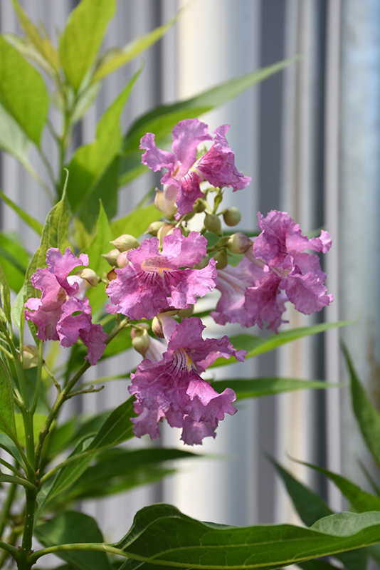 El Nino® Chitalpa features showy panicles of fragrant lilac purple orchid-like flowers with fuchsia overtones, white throats and purple stripes rising above the foliage from late spring to early fall. It has dark green deciduous foliage. The large pointy leaves do not develop any appreciable fall colour.