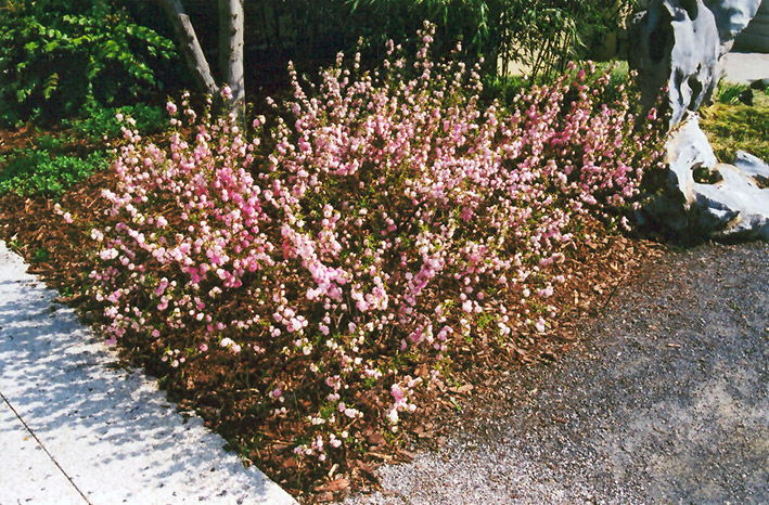 An open, upright shrub smothered in frothy double pink flowers in early spring, redeces to the background the rest of the year, so use in conjunction with other plants for best effect; needs full sun and well-drained soil, most effective in mass plantings