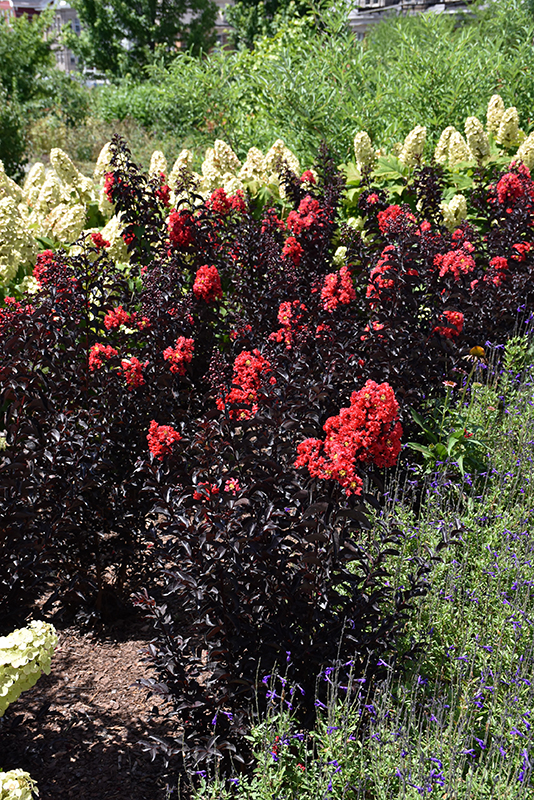 Center Stage® Red Crapemyrtle is smothered in stunning panicles of red frilly flowers with yellow anthers at the ends of the branches from early summer to early fall. It has attractive black foliage with hints of burgundy which emerges coppery-bronze in spring. The glossy oval leaves are highly ornamental and turn dark red in fall. The smooth gray bark and ruby-red branches add an interesting dimension to the landscape.