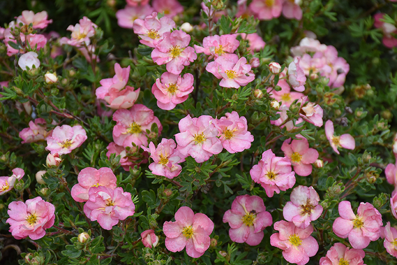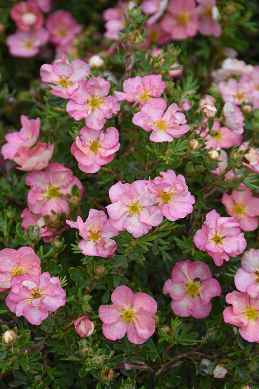 Happy Face Hearts® Potentilla has pink flowers with rose overtones, chartreuse eyes and white centers at the ends of the branches from late spring to mid fall, which emerge from distinctive red flower buds. It has dark green deciduous foliage. The small fuzzy ferny compound leaves do not develop any appreciable fall colour.
