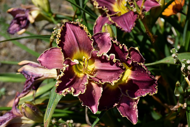 A beautiful midseason bloomer featuring intense wine purple flowers with a neat lemon-yellow picotee edge, rising above mounds of arching green foliage; a prolific rebloomer with great color fade resistance; easy to grow, great for beds and borders