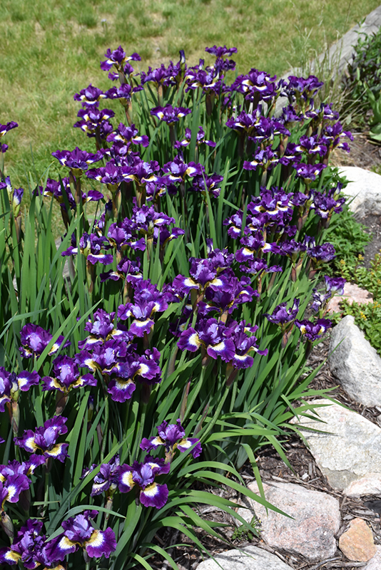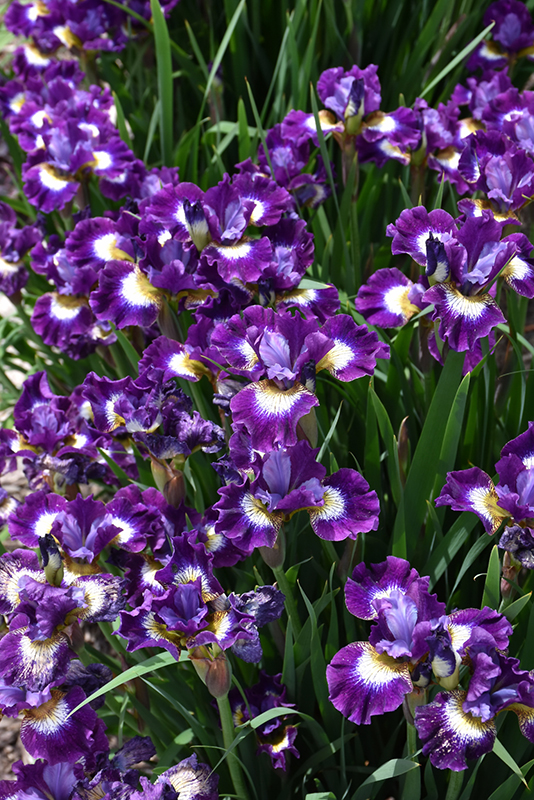 Showy rich purple flowers marked with white and yellow centers and purple veining; semi-flaring falls; blooms emerge from lush, sword-like, foliage from late spring to early summer; an outstanding choice for beds, borders or cut flower arrangements