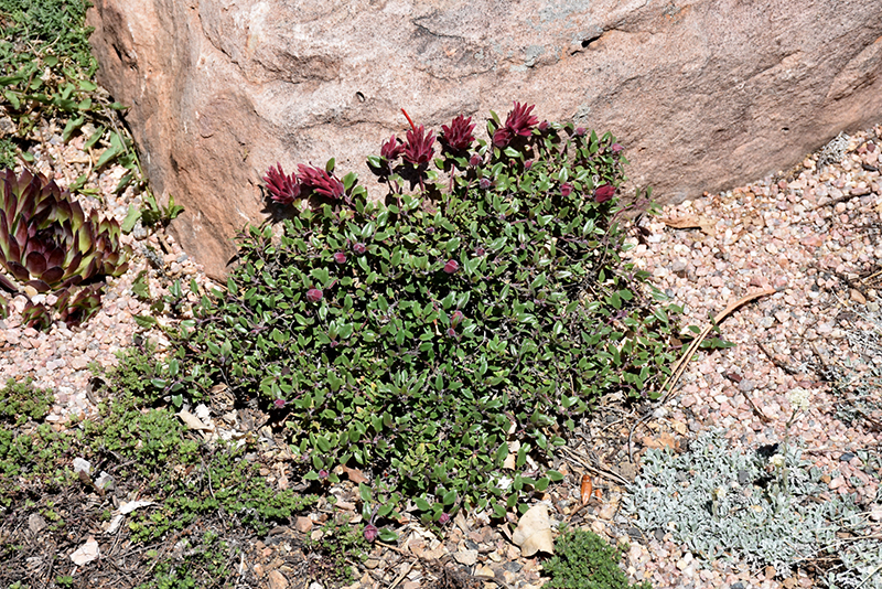 Marian Sampson Scarlet Monardella will grow to be only 3 inches tall at maturity extending to 5 inches tall with the flowers, with a spread of 12 inches. When grown in masses or used as a bedding plant, individual plants should be spaced approximately 8 inches apart. Its foliage tends to remain low and dense right to the ground. It grows at a medium rate, and under ideal conditions can be expected to live for approximately 3 years. As an evegreen perennial, this plant will typically keep its form and foliage year-round.