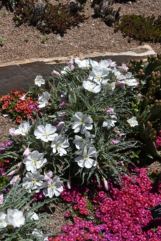 Tufted Evening Primrose will grow to be about 8 inches tall at maturity extending to 12 inches tall with the flowers, with a spread of 24 inches. When grown in masses or used as a bedding plant, individual plants should be spaced approximately 20 inches apart. Its foliage tends to remain low and dense right to the ground. It grows at a medium rate, and under ideal conditions can be expected to live for approximately 5 years. As an herbaceous perennial, this plant will usually die back to the crown each winter, and will regrow from the base each spring. Be careful not to disturb the crown in late winter when it may not be readily seen!